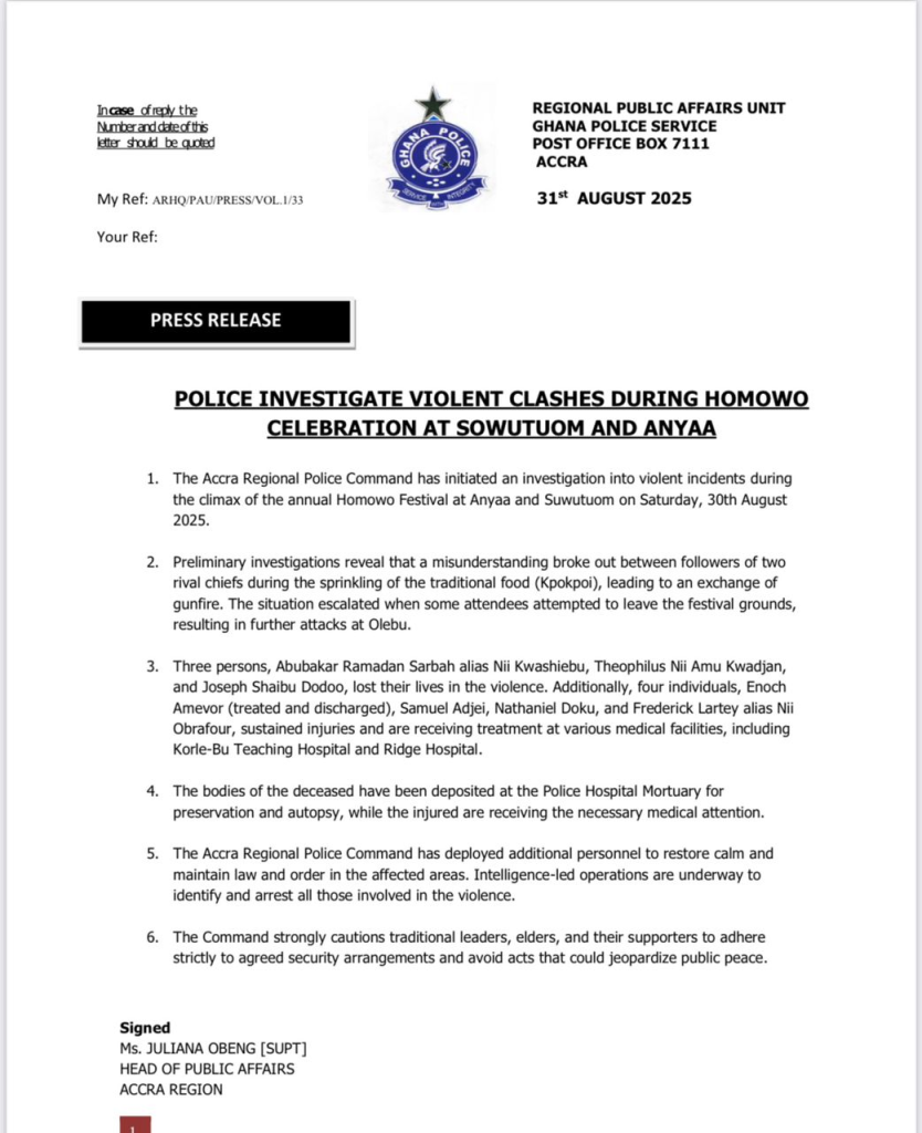 The climax of this year’s Homowo Festival in Sowutuom and Anyaa in the Greater Accra Region was marred by deadly violence on Saturday, August 30, leaving three people dead and four others injured.