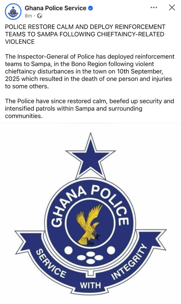 Calm has returned to Sampa in the Bono Region following violent chieftaincy-related disturbances that broke out on September 10, 2025, leaving one person dead and several others injured.