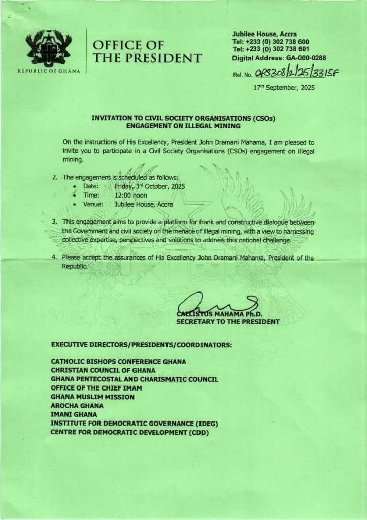 The meeting, scheduled for Friday, October 3, 2025, at 12:00 noon, will take place at the Jubilee House and will bring together government officials and civil society leaders to deliberate on sustainable solutions to the environmental and social crisis caused by galamsey.