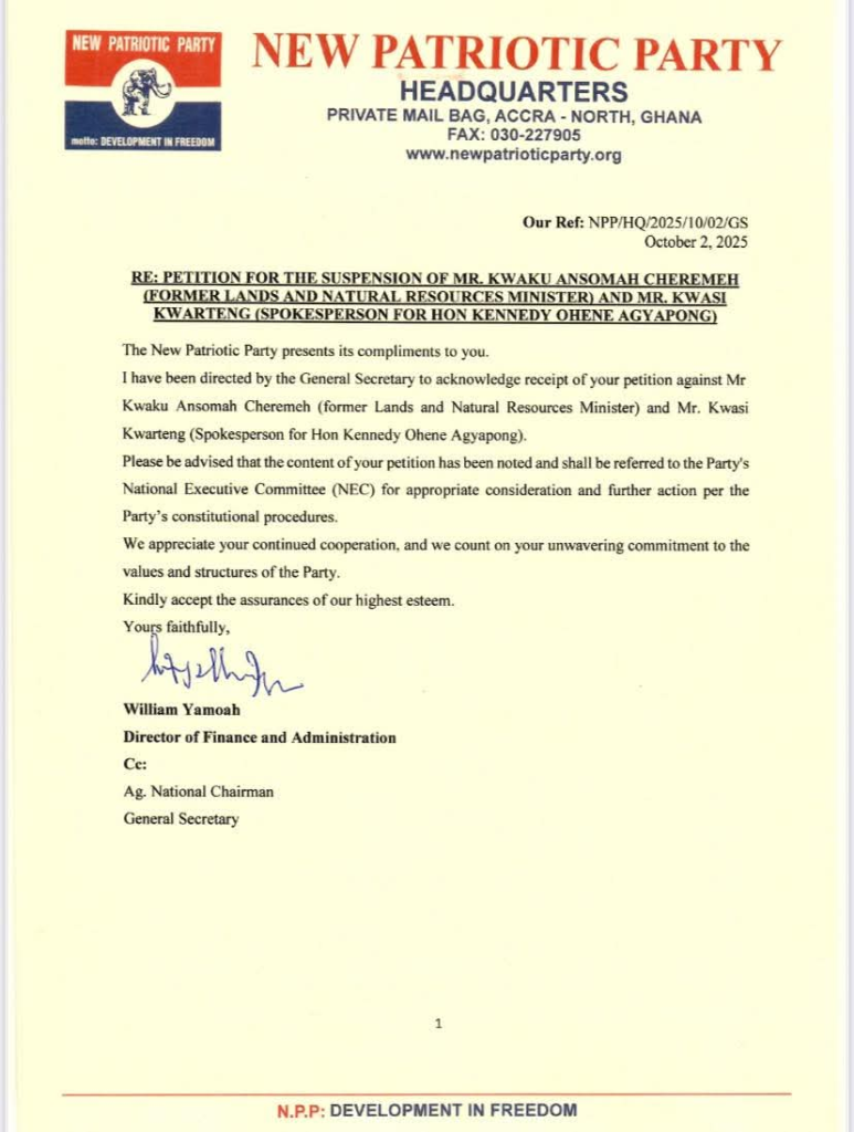 The New Patriotic Party (NPP) has confirmed receipt of a petition calling for the suspension of former Lands and Natural Resources Minister, Kwaku Asomah-Cheremeh, and Kwasi Kwarteng, spokesperson for presidential aspirant Kennedy Ohene Agyapong.